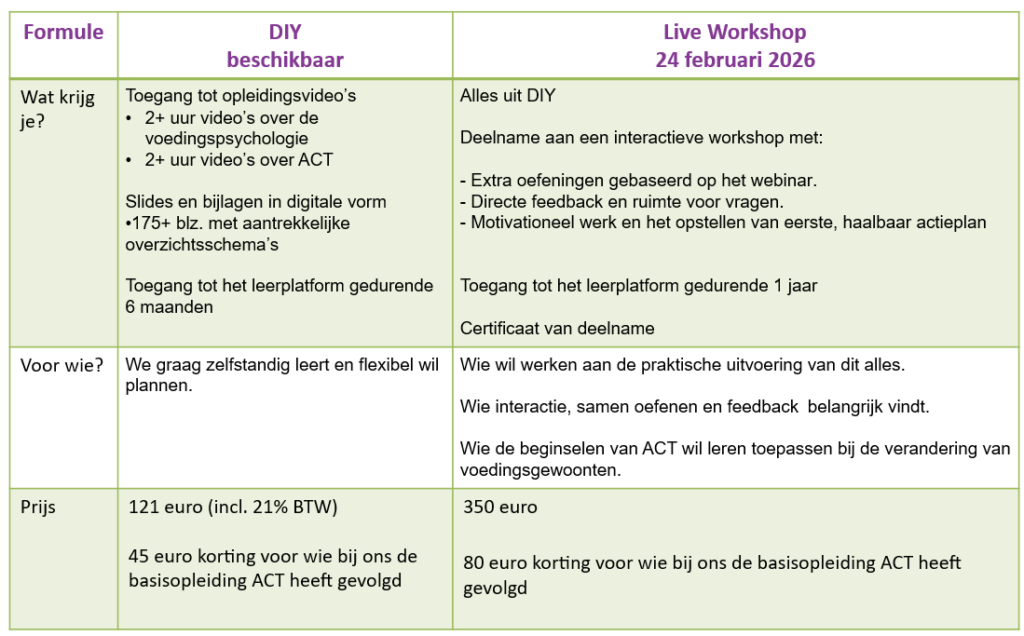 In de kennismaking ‘Voedingspsychologie & ACT’ krijg je een introductie tot ACT via een webinar. Indien je de basisopleiding ACT reeds hebt gevolgd (vanaf 2020), heb je deze video’s reeds bekeken. Dan geniet je van een korting op deze workshop. Vraag deze aan bij info@act-academie.be