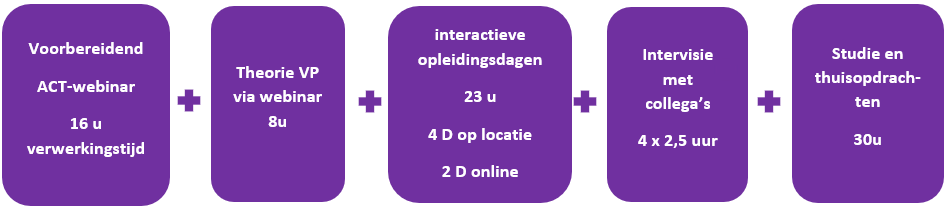 In de opleiding Voedingspsychologie & ACT krijg je eerst een tweedaagse introductie tot ACT via een webinar. Tijdens het interactieve deel van de opleiding leer je ACT specifiek toepassen op het veranderen van voedingsgewoonten. Daarnaast leer je de algemene principes van ACT die je ook kunt gebruiken voor andere psychische klachten, maar hierop wordt veel minder geoefend dan in de volledige basisopleiding ACT.